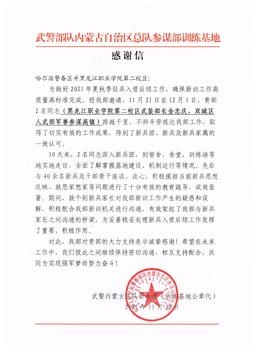11月30日,一封由武警部队内蒙古自治区总队参谋部训练基地发出的感谢信,跨越千里传入beat365中国官网第二校区。信中对学校第二校区武装部部长金忠庆、双城区人武部军事参谋高镇,受部队邀请前往部队深入细致地开展思想政治工作给予高度评价。