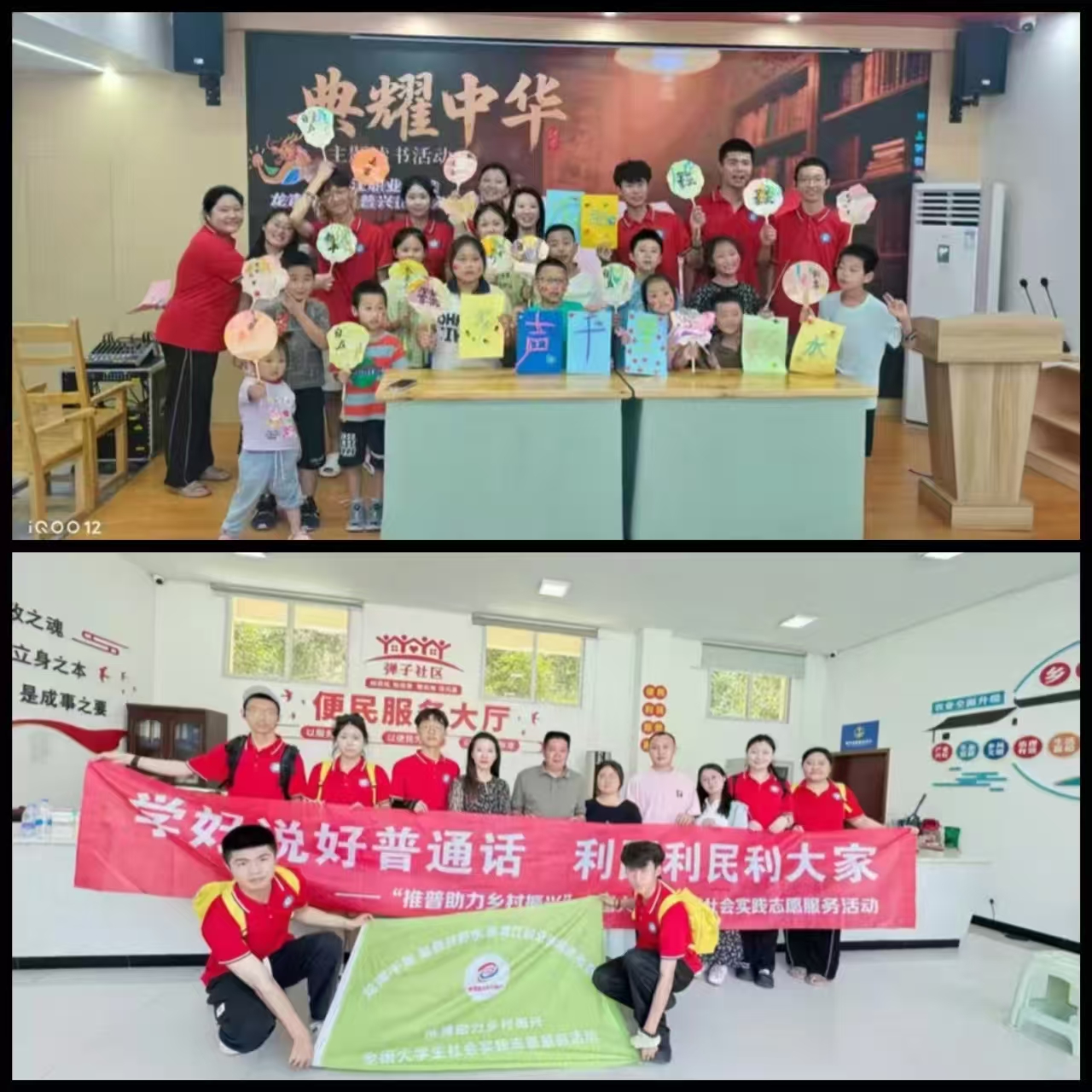 在弹子社区,实践团与社区主任座谈后,针对工作人员普通话短板开展场景教学,模拟办事窗口演练;在五湖社区托管班,用国家通用语言平台“普通话小镇”APP进行普通话发音实训,AI技术与诗人跨越时空对话。“典耀中华”汇演上,孩子们字正腔圆齐诵《少年中国说》,点燃爱国情怀。活动融合非遗漆扇绘制等文化载体,构建“数字推普+经典传承”新模式。