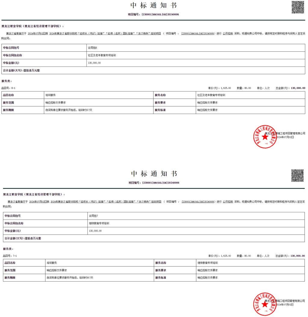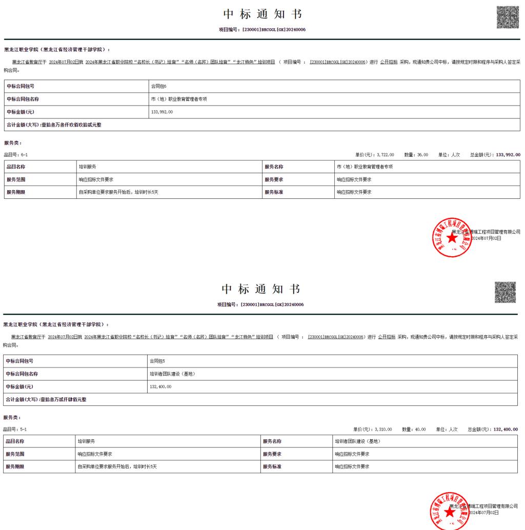 7月2日,beat365在2024年黑龙江省职业院校“名校长(书记)培育”“名师(名匠)团队培育”“龙江特色”等培训项目中脱颖而出,投递的4个标段项目全部中标,中标金额共计52.63万元。