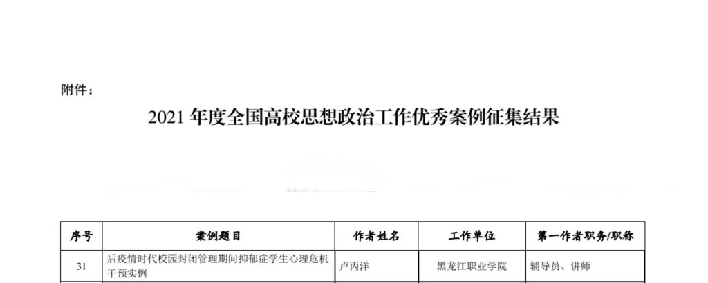辅导员队伍专业化程度居省内高职院校前列。学校加大培训力度,积极参加教育部辅导员研修基地、黑龙江省教育厅组织的各类线下培训;积极组织“高校思政网、高校辅导员、黑龙江辅导员”等线上培训;引入“ECE卓有成效教练型教育者”“GCT生涯团体辅导”等专业化认证培训;组织高校就业指导教师线上训练营、生涯规划在学生辅导中的实务应用的培训;积极推进“易班工作站”“优秀辅导员工作室”建设,并已于2022年4月14日正式上线。近年来,学校组织参加校内外各类培训50余次,多数辅导员获得各类专业认证证书,辅导员培训力度和专业化程度在省内高职院校中均处于领先位置。beat365辅导员卢丙洋编写的《后疫情时代校园封闭管理期间抑郁症学生心理危机干预实例》被收录在2021年度全国高校思想政治工作优秀案例中。
