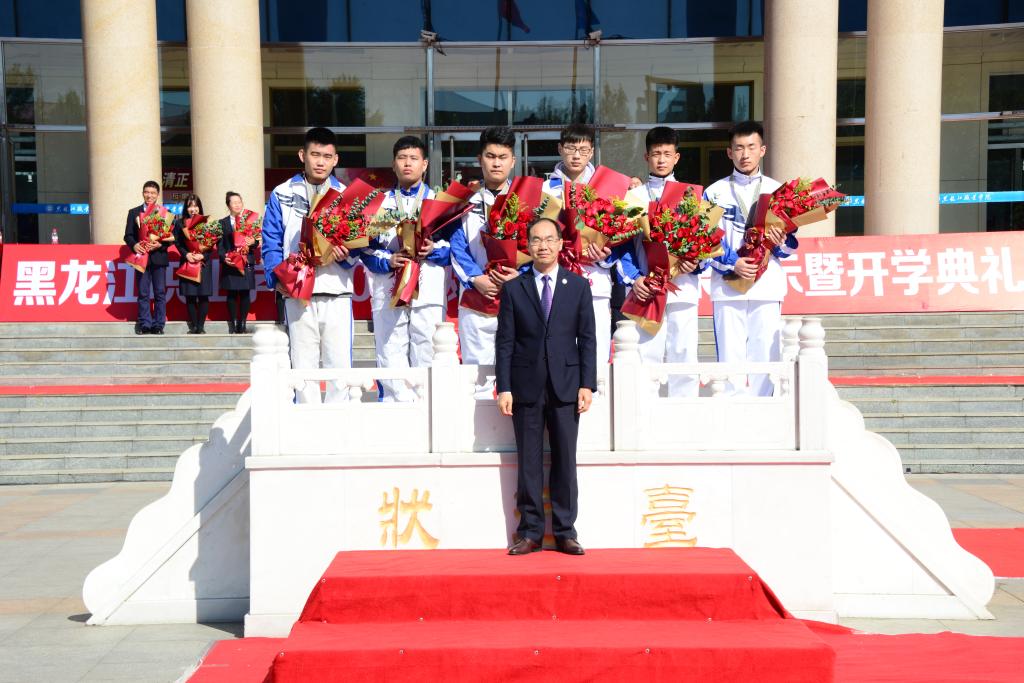 在9月20日开学典礼上,学校举办了第六届“颁龙职奖·登状元台”活动。 在学校师生的瞩目下,获奖师生依次走上红地毯,登上“状元台”,学校领导分别为他们颁发“龙职奖”奖牌,并合影留念。