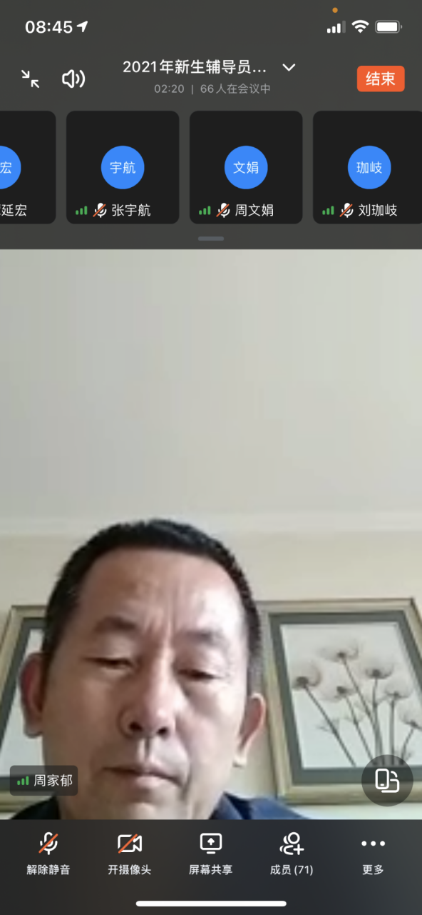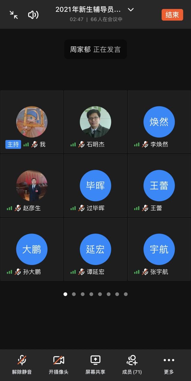 8月25日,学校第十九期辅导员培训班暨2021年新生辅导员、新入职辅导员岗前培训通过 “钉钉”APP以线上会议形式进行。学校党委副书记周家郁、学工部班子成员、各二级学院学管院长、学管办主任及全体新入职辅导员、新生辅导员参加培训班开班式,学工部长石明杰主持开班式培训会。
