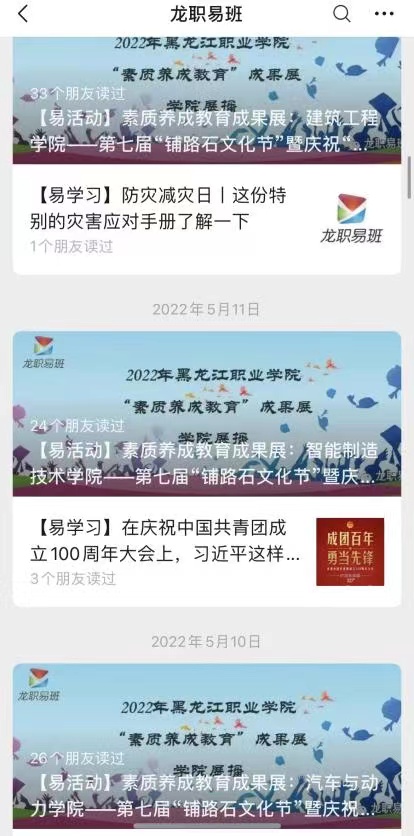 为进一步展现学校素质养成教育成果,营造积极向上、求实创新的学习氛围,引导学生养成良好习惯,促进学生素质全面提升,按照学校第七届“铺路石文化节”暨庆祝“龙职”成立10周年系列活动安排,4月18日——5月18日,学工部开展了“素质养成教育”成果征集、“素质行动达人”评选、二级学院“素质养成教育”成果展播等系列活动。
