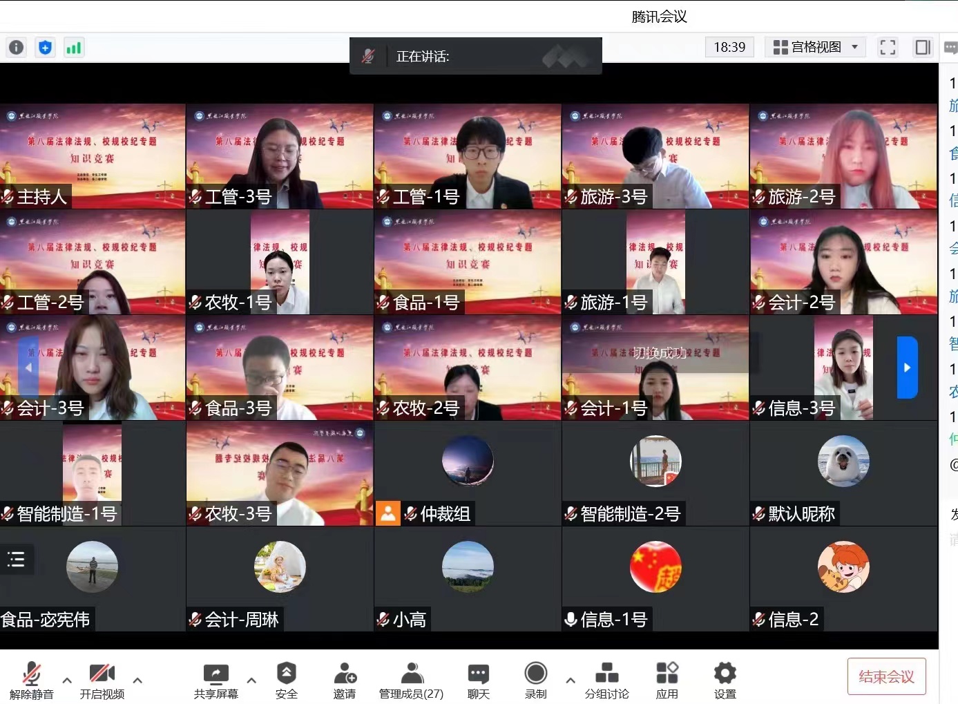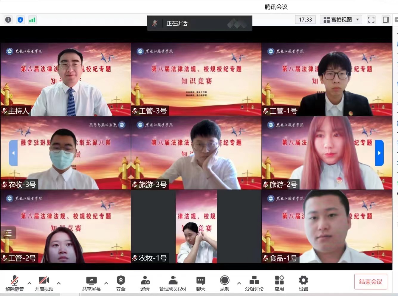 6月7日上午,第八届“法律法规、校规校纪”专题知识线上竞赛成功举办。学校党委副书记周家郁、学工部班子、二级学院党总支副书记、学管办主任和2021级辅导员参加了此次活动。