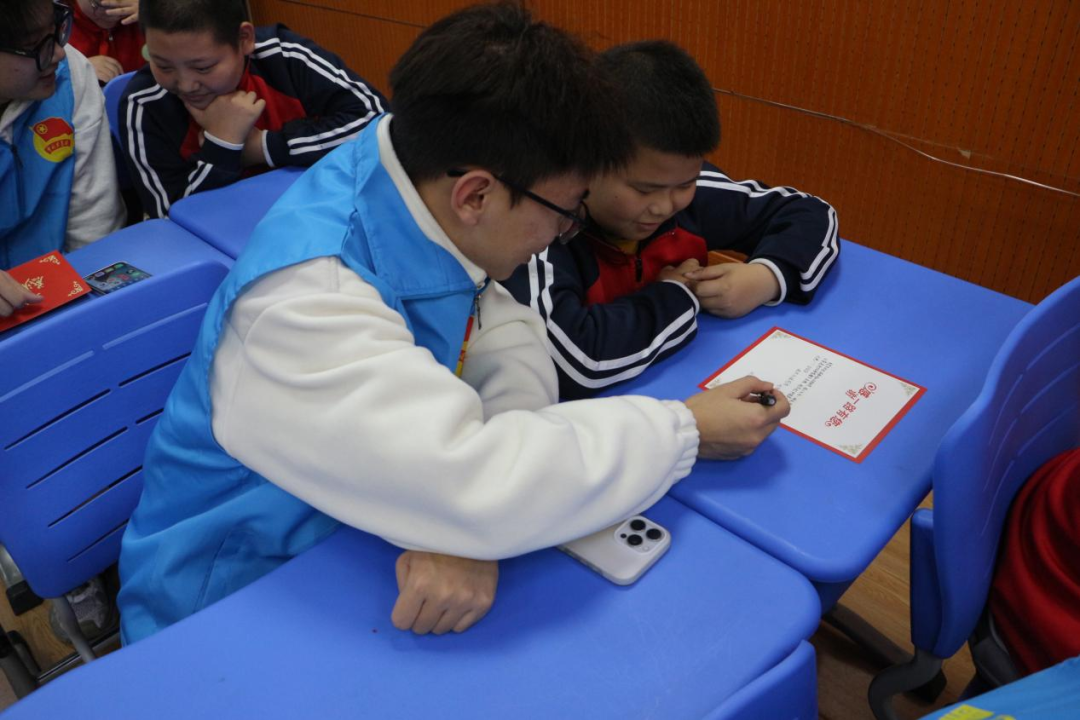 “一对一结对子”环节中,志愿者与困难学生互换手写祝福卡片、互留联系方式,在真诚交流中明确了后续学业答疑、生活关怀等常态化帮扶方向,让短暂的关爱转化为长期的陪伴与支持;集体互动游戏环节趣味十足,“默契猜词”“你比划我猜”等经典游戏迅速拉近彼此距离,欢声笑语中,信任与默契悄然升温。
