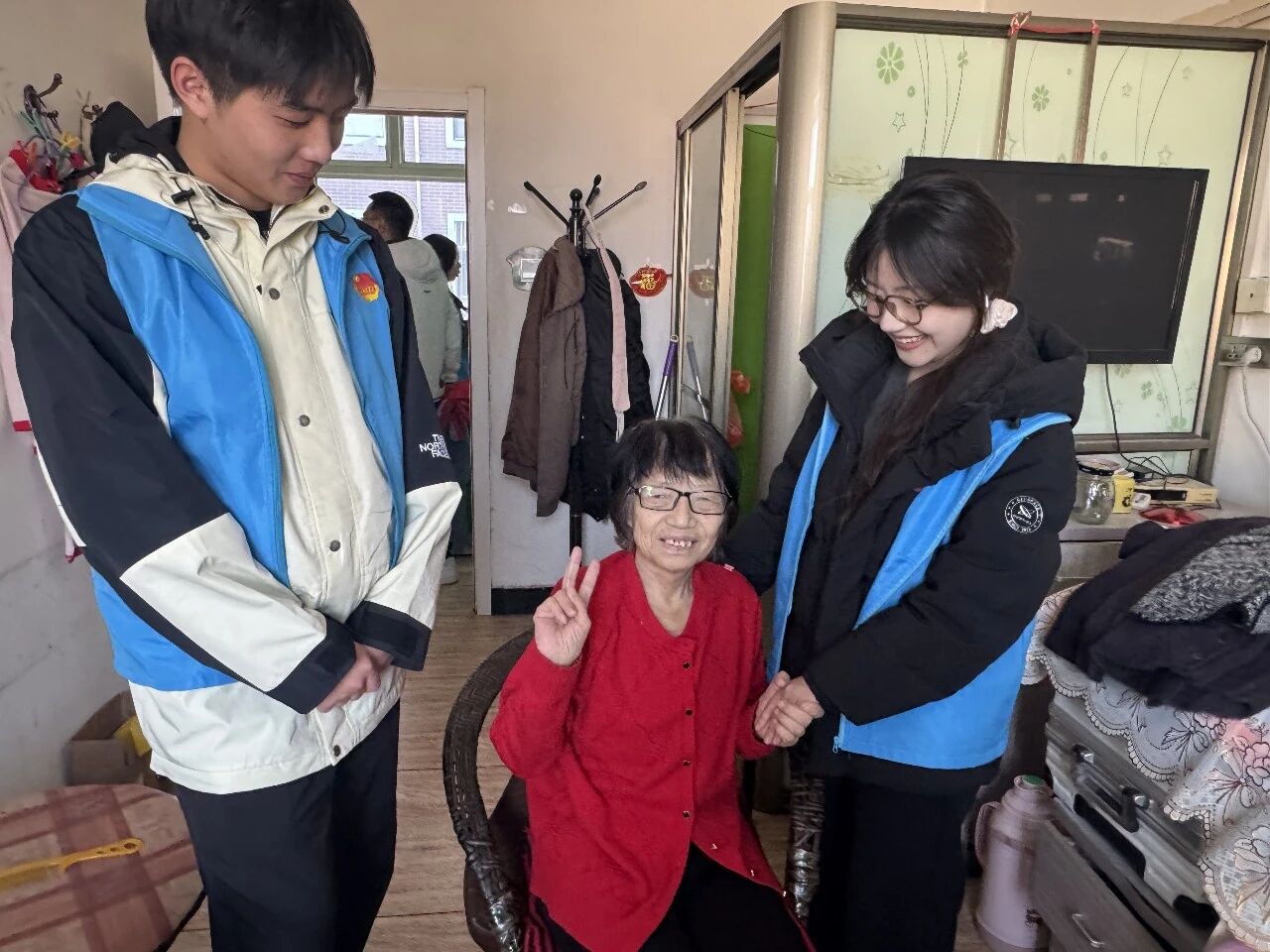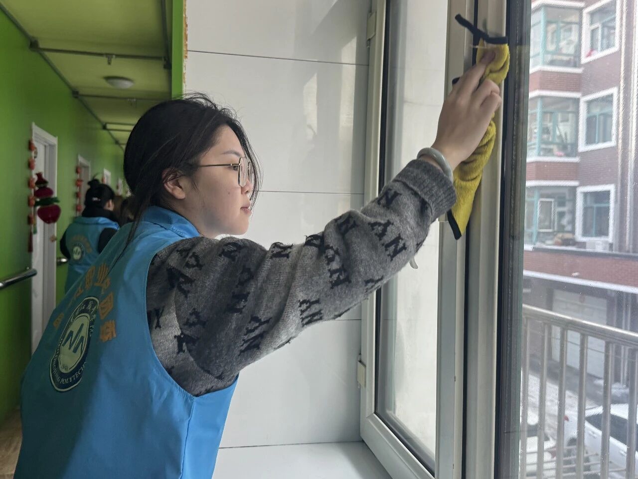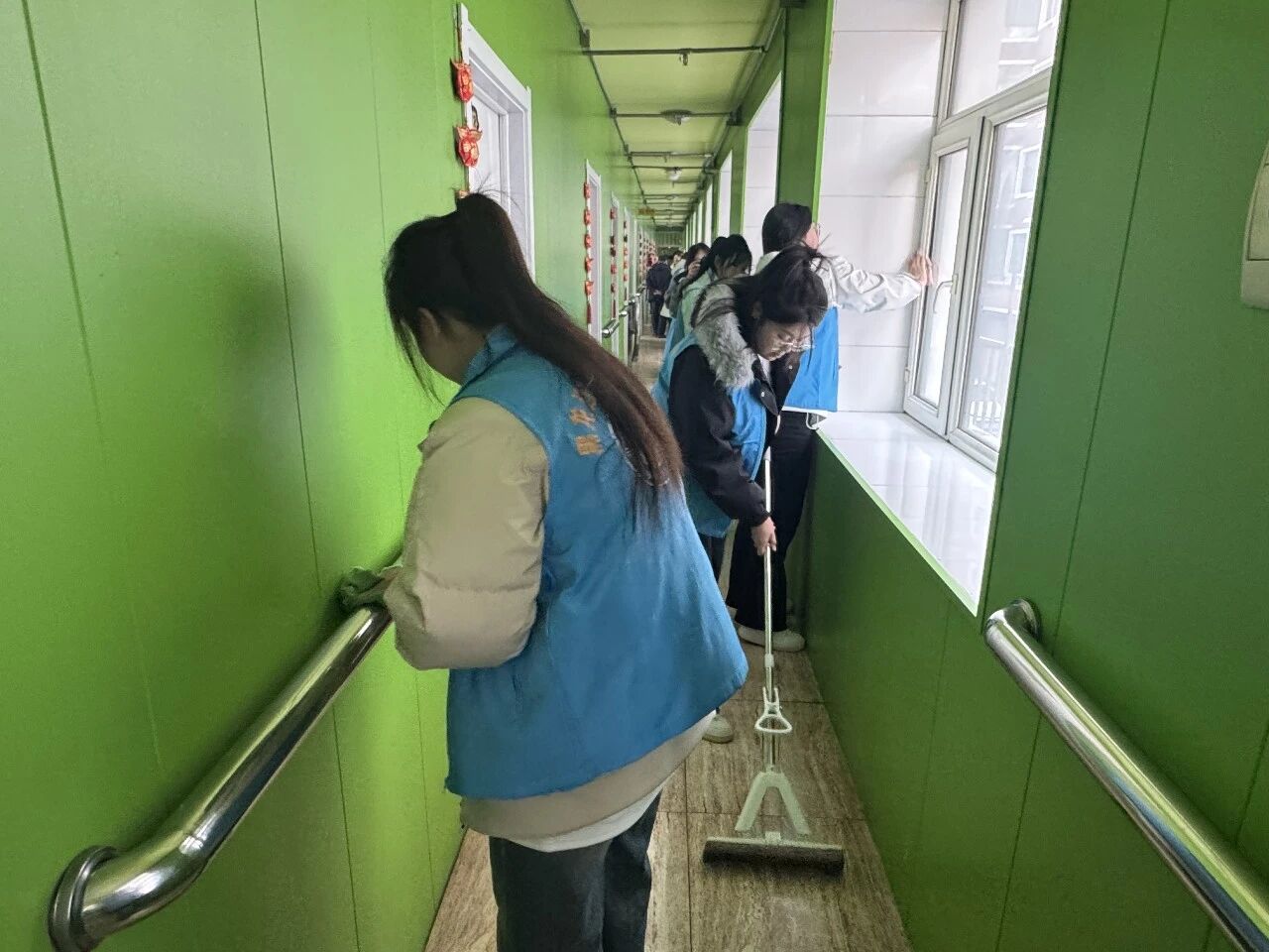 下午13:30,志愿者们如约抵达老年公寓。宁静的小院顿时热闹起来,涌动着一股青春的暖流。屋内屋外,随处可见俯身劳动的身影:他们手持清洁工具,仔细擦拭着走廊的扶手,认真清扫着院落的每一个角落,力求为老人们创造一个窗明几净、舒适宜居的生活环境。与此同时,在洒满阳光的房间里,另一番温情的画面正在上演——志愿者们俯身坐在老人们身旁,紧紧握住那双写满岁月沧桑的手,或是侧耳倾听老人们讲述年轻时的奋斗故事。欢声笑语驱散了往日的沉寂,温情的陪伴让老人们脸上绽放出久违的笑容。