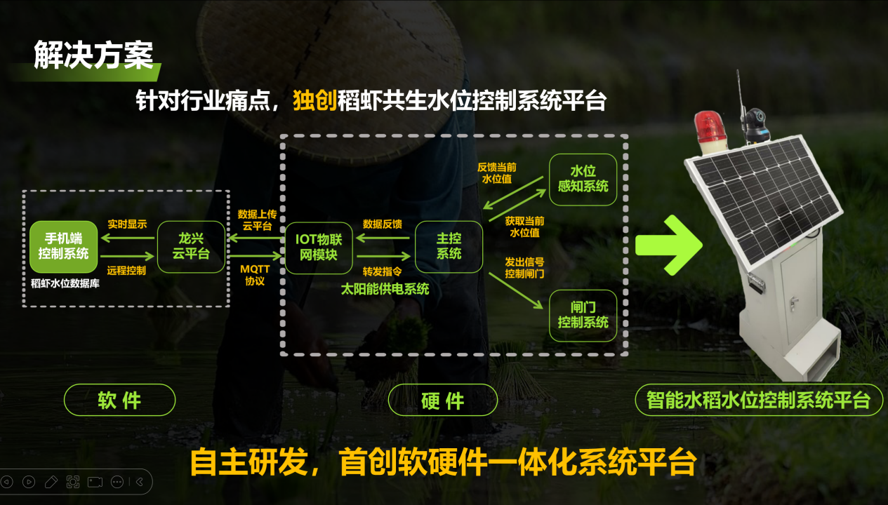项目简介:本项目是针对稻虾共生行业痛点打造的智能解决方案,源于下乡实践中发现农户劳作辛苦、收益低的困境。项目首创软硬件一体化智能水稻水位控制系统平台,以龙芯芯片主控板、MQTT协议手机端软件、自主云平台为核心技术,实现99%水位精准控制、100%水质实时监测,节省灌溉时间60%、流量65%。