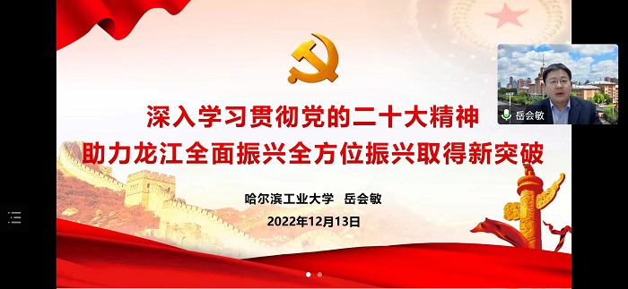 12月13日下午,黑龙江省教育系统学习贯彻党的二十大精神宣讲团为beat365宣讲党的二十大精神,哈尔滨工业大学党委宣传部常务副部长岳会敏以《深入学习贯彻党的二十大精神 助力龙江全面振兴全方位振兴取得新突破》为题,线上为全校师生进行了提纲挈领、条分缕析的讲解。副校长郑福贵主持会议。学校领导班子成员、全体处级干部和师生代表参加会议。