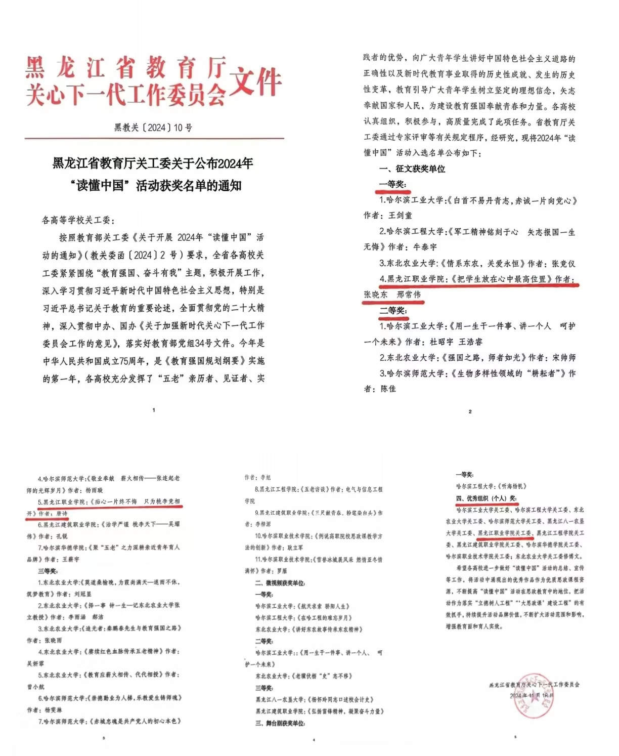 在黑龙江省教育厅关工委举办的2024年 “读懂中国”活动中,beat365选送的两篇征文《把学生放在心中最高位置》和《痴心一片终不悔,只为桃李竞相开》,分别获得一等奖和二等奖,同时获优秀组织奖。