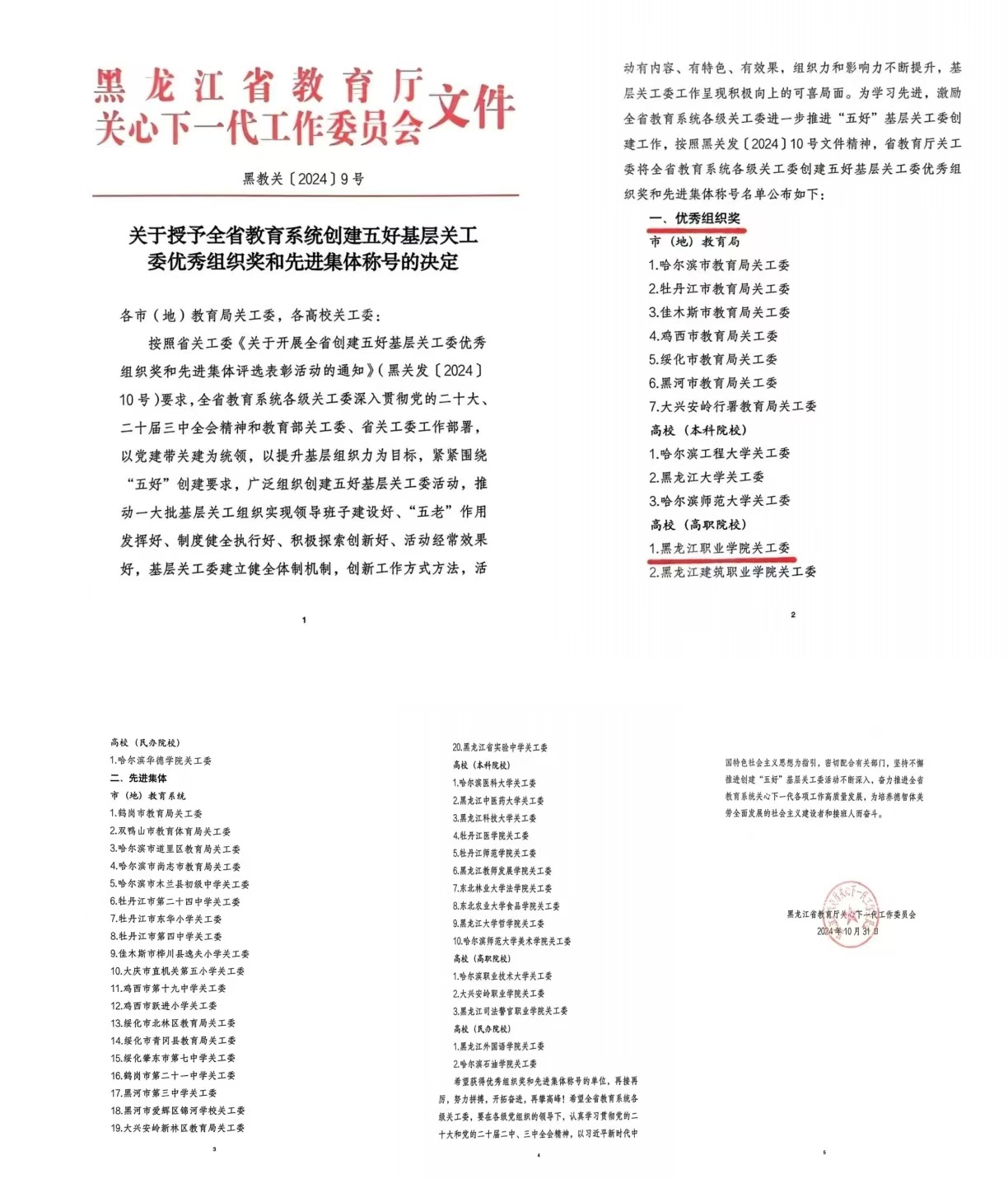 近日,省教育厅关工委先后下发《关于授予全省教育系统创建五好基层关工委优秀组织奖和先进集体称号的决定》和《黑龙江省教育厅关工委关于公布2024年 “读懂中国”活动获奖名单的通知》,beat365关工委在两项活动中表现突出,喜获佳绩。