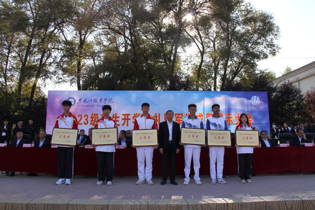 张金龙表示,“龙职”学子们高质量、高标准地完成为期19天的军事技能训练。通过军训,同学们树立了高度的集体荣誉感,磨炼了坚毅的意志品质,展示了青春向上的活力和斗志昂扬的精神,希望同学们把这次军训取得的成果转化为努力学习、刻苦钻研的强大精神动力,进一步提升思想意识,增强身体素质。李伟宣读了《关于表彰2023级新生军训先进集体的决定》,学校领导为受到表彰集体颁奖。