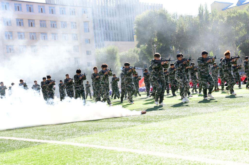 8时30分,升旗仪式正式开始,在庄严的国歌声中,五星红旗缓缓升起,拉开开学典礼序幕。首先,进行的是军训成果展示,分列式上各军训方队同学以整齐的步伐、嘹亮的口号、饱满的热情、昂扬的斗志、坚定的信念展示了为期三周的军训成果,为“大学第一课”交出一份精彩的青春答卷。军训方队代表队进行了擒敌拳、格斗基础、战术基础、内务整理等军训科目展示,在校大学生退役士兵展示了摔擒、小队战术科目。