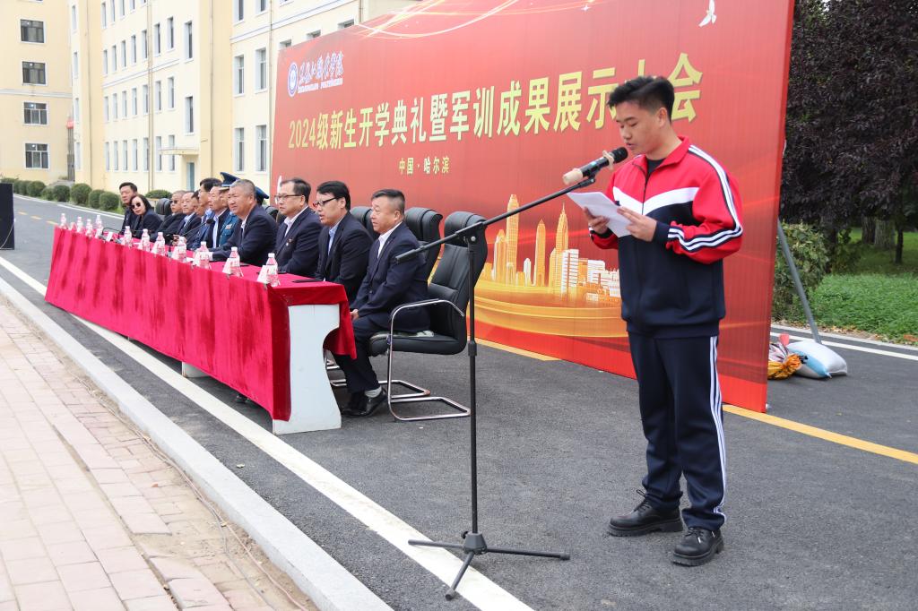 能源与汽车工程学院学生闫勇旭代表全体2024级新生发言。他说,在校园,看到了志愿者辛勤忙碌的身影,听到辅导员一日无数遍的问候和嘱托,感受到同学们彼此间一句“加油”的鼓励……这是一个包容、友爱、和谐、积极、向上的集体,作为“龙职”人,很骄傲。作为“龙职”青年,要以“龙职青年心向党,强国有我显担当”的豪迈,积极弘扬“自强有为 兴业报国”的“龙职”精神,秉承明理、善思、笃行、乐学的学风,弘扬工匠精神,立志技能报国,奋力书写为中国式现代化挺膺担当的青春篇章,用拼搏与努力向祖国75岁生日献礼。