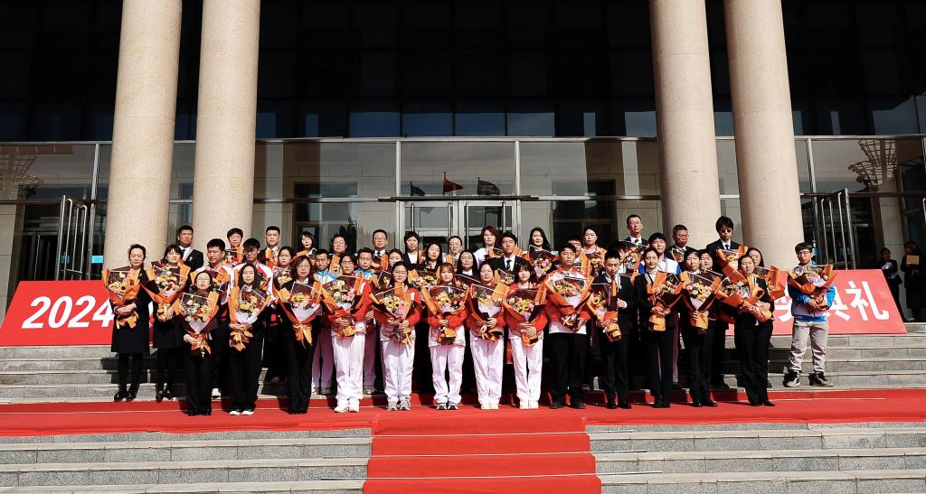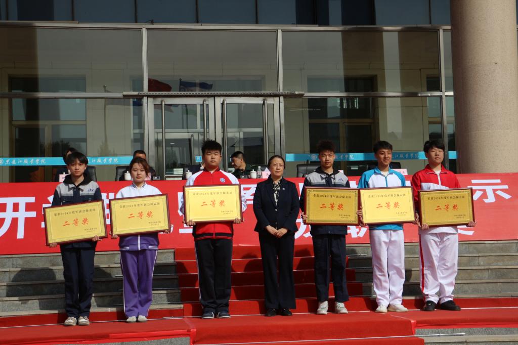 在2024年度“颁龙职奖·登状元台”活动中,“龙职”奖金奖、银奖、铜奖获奖代表自信阳光地登上状元台,学校领导为他们颁发“龙职”奖奖牌,他们手捧鲜花,接受全校师生的祝贺。