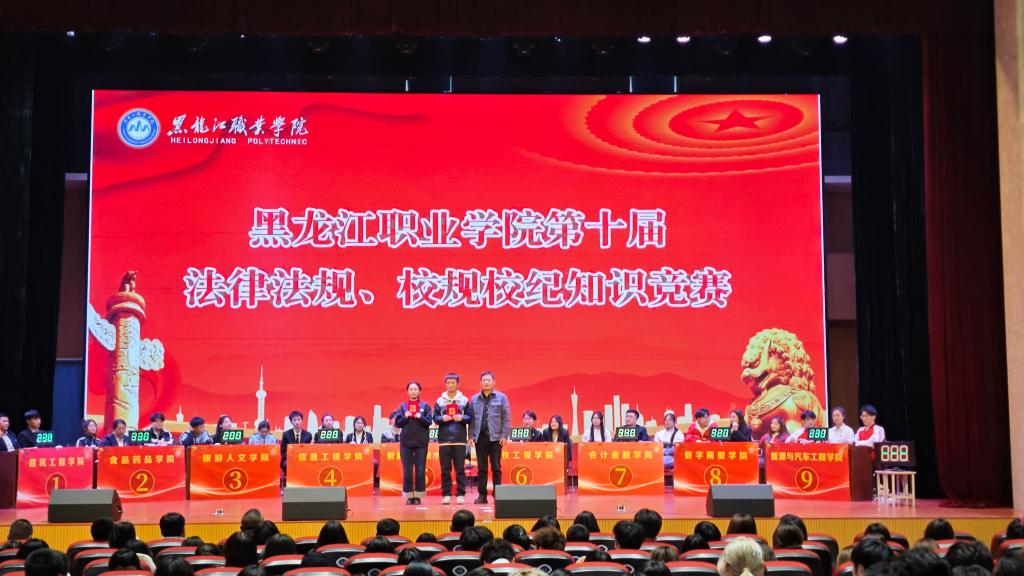 本次活动以宪法教育、校规校纪教育、法制安全教育为重点,坚持学用结合的原则,通过线上+线下的方式,全面开展法津法规、校规校纪教育工作。竞赛首次启动线上全员答题模式,全校共4169名2024级学生参加答题,各二级学院遴选出1名辅导员和2名学生组成代表队参加校级竞赛。参赛选手精神饱满、斗志昂扬、积极踊跃,精彩表现赢得了现场观众的阵阵掌声。经过紧张激烈角逐,最终,会计金融学院代表队荣获一等奖。