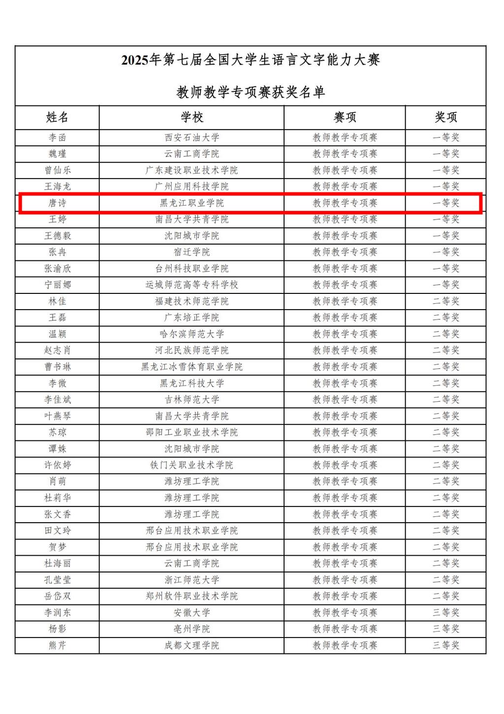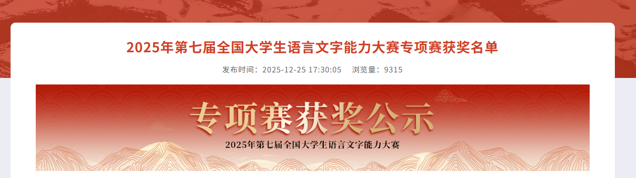 近日,2025年第七届全国大学生语言文字能力大赛教师教学专项赛获奖名单公布,beat365通识教育学院传统文化与美育教研室主任唐诗老师凭借扎实的教学功底、创新的教学理念与深厚的专业素养,在全国百余所本科及职业院校的激烈竞争中脱颖而出,荣获一等奖。