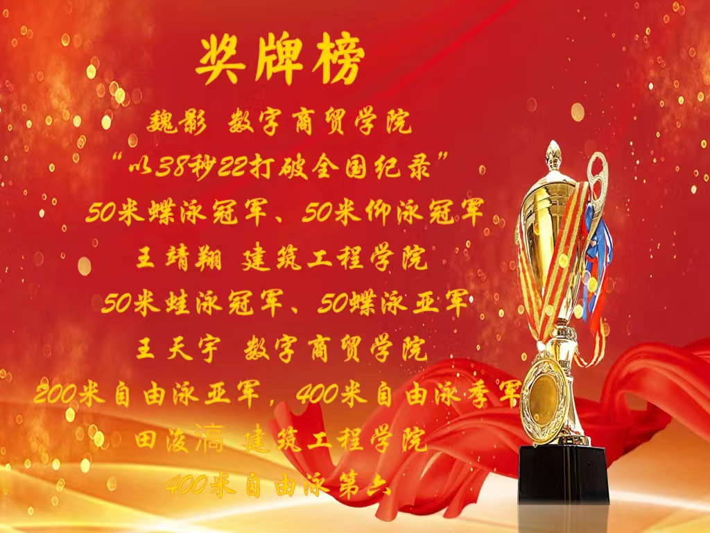 本次赛事由中国学生体育联合会主办、兰州市体育局承办,是我国大学生游泳项目的最高赛事之一,将全国高校分为“北方赛区”和“南方赛区”,北方赛区赛事规模宏大,共有北京大学、清华大学、北京体育大学等80所高校733名运动员参赛。这是beat365游泳队首次冲进全国比赛,他们奋“泳”拼搏,发挥出色,经过四天激烈角逐,队员们凭借单项赛事的优异成绩荣获乙组女子团体总分第二名、乙组男子团体总分第四名、乙组团体总分第四名。数字商贸学院的魏影同学夺得女子乙组50米蝶泳和50米仰泳两项冠军,并以38秒22成绩打破女子50米仰泳项目的全国赛会纪录。