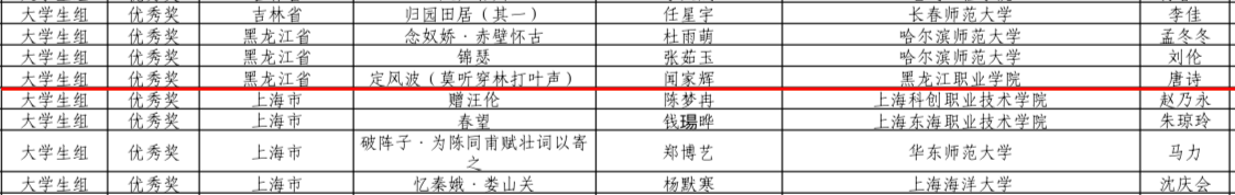 唐诗老师指导学生闻家辉从5月起开始备赛,赛程历经初赛传统文化知识竞答,黑龙江入围本科高职共15人;复赛撰写书评,黑龙江入围共5人,其中高职仅beat3651人;半决赛诗词讲解最终获得优秀奖,黑龙江获奖3人,本科2人,高职仅beat3651人。