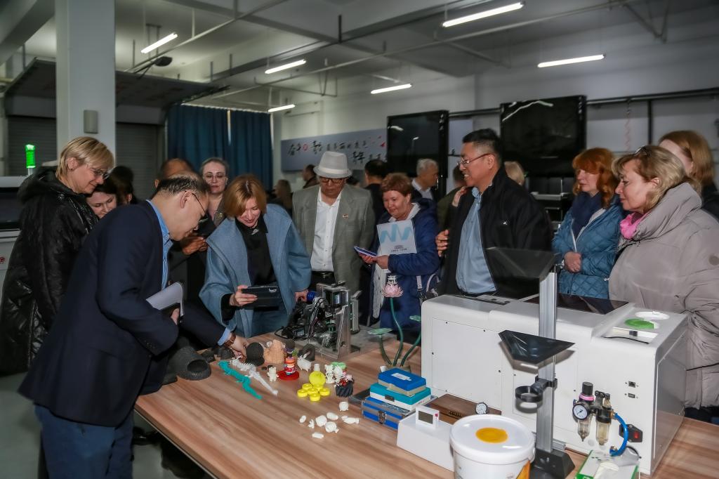 会后,访问团一行在何志鹏副校长的陪同下,参观了虚仿基地、工业中心、3D打印实训室、工业机器人实训室和智慧零售生产性实训基地。在参观过程中,讲解人员详细介绍了各个实训基地的建设情况、设备设施以及在人才培养中发挥的重要作用。访问团成员对学校先进的实训设施和创新的人才培养模式给予了高度评价。双方就实训基地建设、实践教学等方面进行了深入交流。