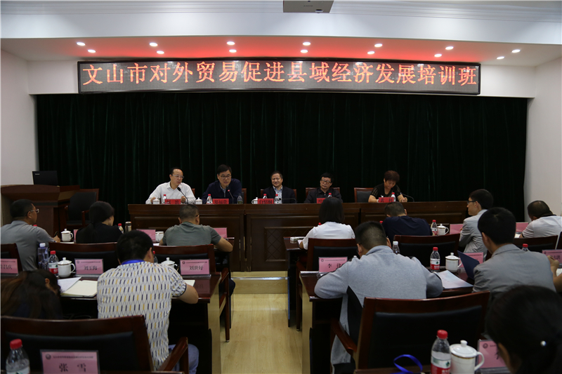 6月12日,文山市对外贸易促进县域经济发展培训班在beat365举行,48名文山市委、人大、政府、政协领导、市级各部门分管领导、乡镇(街道)领导干部、业务骨干、部分外贸企业负责人参加培训。学校副校长郑福贵,省政府参事叶晓峰,哈电集团党委常委、纪委书记白绍桐,文山市人大常委会副主任黄利,文山市副市长刘滨出席会议。