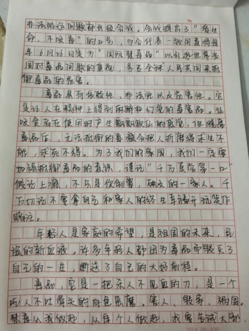 三是组织了一次禁毒知识答题活动。将认识毒品、预防毒品、远离毒品等知识点融入到各类题型当中,通过问答的形式将禁毒教育深入到学生心里。