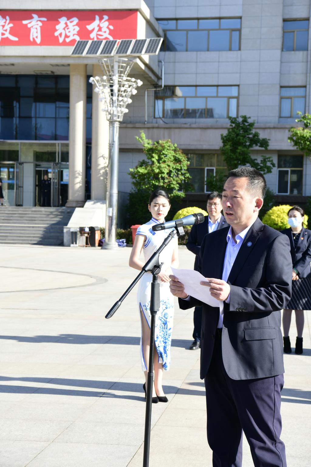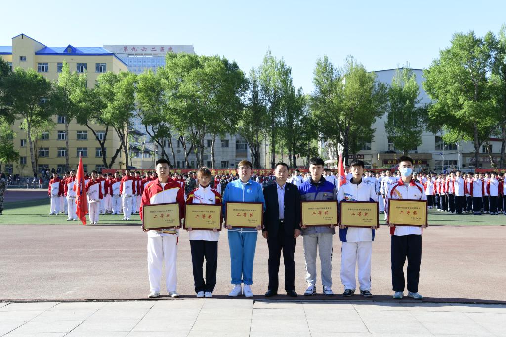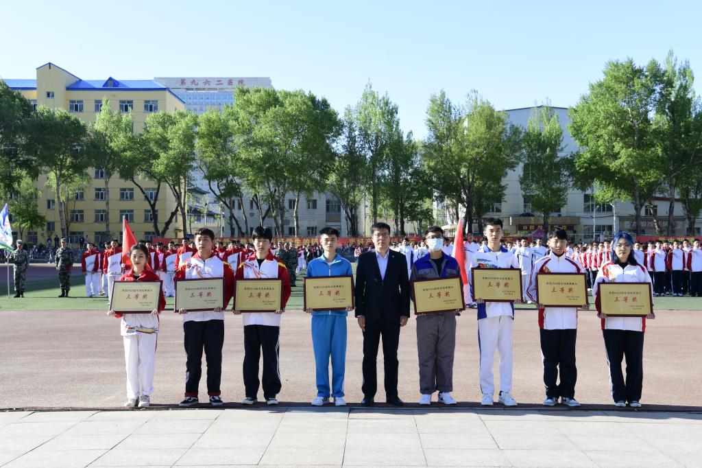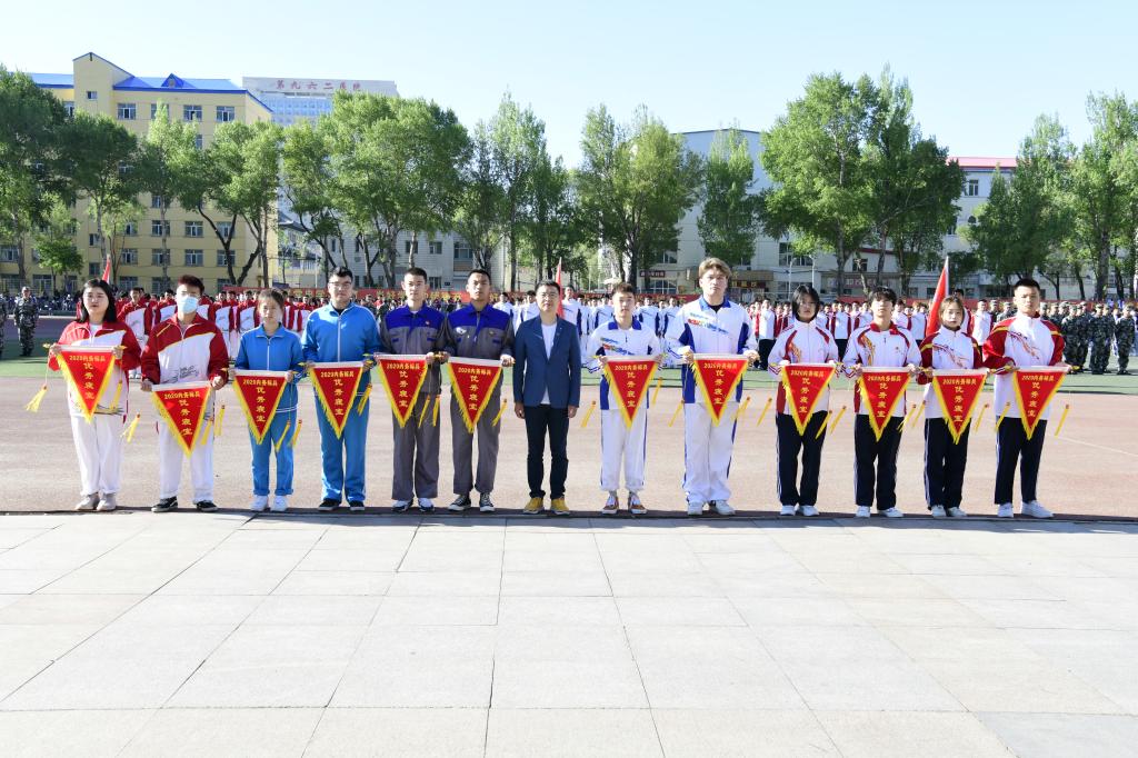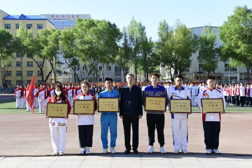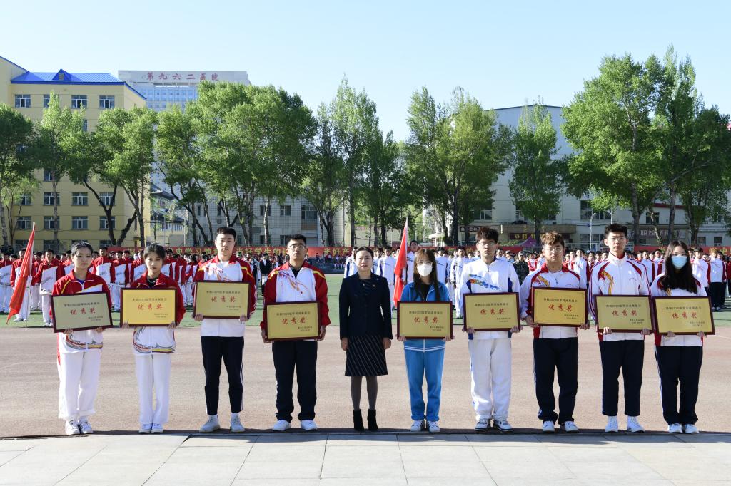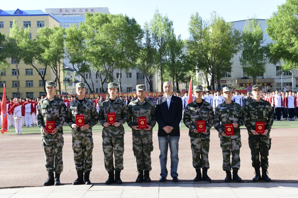 周家郁宣读本次军训先进集体和先进个人的表彰决定。学校领导和学工部班子成员现场为获得优秀寝室代表、优秀自训教官代表和军训优秀集体代表颁发了奖状。