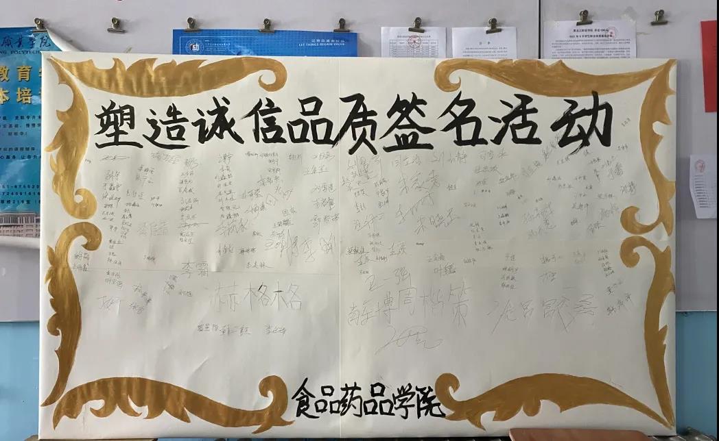 为进一步强化我院同学的诚信意识,引导我院同学树立求真务实的诚信形象,塑造良好的诚信品质,食品药品学院于2021年5月25日在一号教学楼开展“塑造诚信品质”签名活动,我院学生会宣传部及2020级部分同学参加。