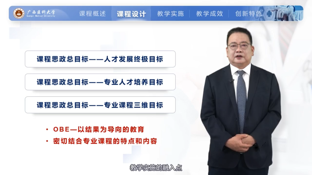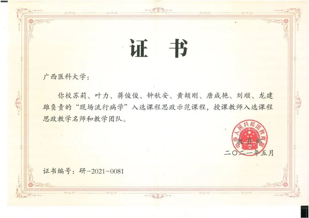 课程方面:教学改革获得广西高校教学成果奖一等奖、广西医科大学教学成果特等奖。2020年评为自治区级一流本科课程,2021年评为教育部课程思政示范课程,现拥有国家级课程思政教学名师1人、核心教学团队1支。课程思政建设和教学经验在第三届中国模拟医学大会、西部临床医学教育联盟、教育厅广西高校研讨会和区内外10多家高校宣传推广。