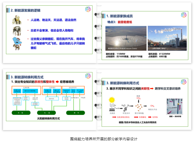 ③能力方面重在培养历史思维、辩证思维、系统思维和创新思维能力等。比如,通过从历史发展的维度系统分析新能源发展的历史逻辑,以及通过梳理燃料和电力的发展历史和趋势等培养学生的历史思维;通过辩证地分析新能源的环保性,新能源产业发展中的安全问题等培养学生的辩证思维;通过构建太阳能、风能、生物质能、地热能等各种新能源的整体转换技术路线图培养学生的系统思维;通过化学与生物、物理与化学等多学科交叉进行新能源技术创新案例的挖掘,引导跨学科交叉意识,培养学生的创新思维等。
