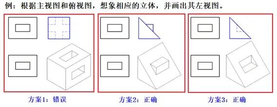 采用问题引入式,引入两组视图,如图2和图3所示,采用讲授式、启发式和讨论式讲解理论知识。由图2可知,两个视图不能唯一确定它们所对应的形体,需要把几个视图联系起来分析。分析图2和图3可知,抓住立体的特征视图能既快又准确的构想出相应的立体,读懂图样。