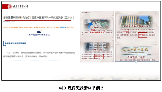 中医药文化博大精深,几千年来在中华民族认识生命、维护健康、防治疾病中发挥了巨大作用。讲针灸作用效应特点时,结合抗疫期间中药、针灸在新冠肺炎预防、诊疗、康复过程中发挥的作用,国外“抗疫”中中草药的应用及教师针灸助孕的临床疗效,鼓励学会增强文化自信、专业自信。在中医药继承、发展、传播中贡献力量。