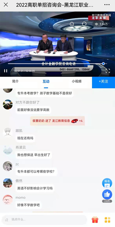 在一个小时的直播过程中,在线人数高达1.54万人。整个交流过程互动不断、气氛热烈。此次网络直播咨询会对推进我院招生工作起到了重要作用。下一步,我院将继续实施多渠道、实效明显的招生宣传形式,为广大考生和家长提供更好地报考服务。