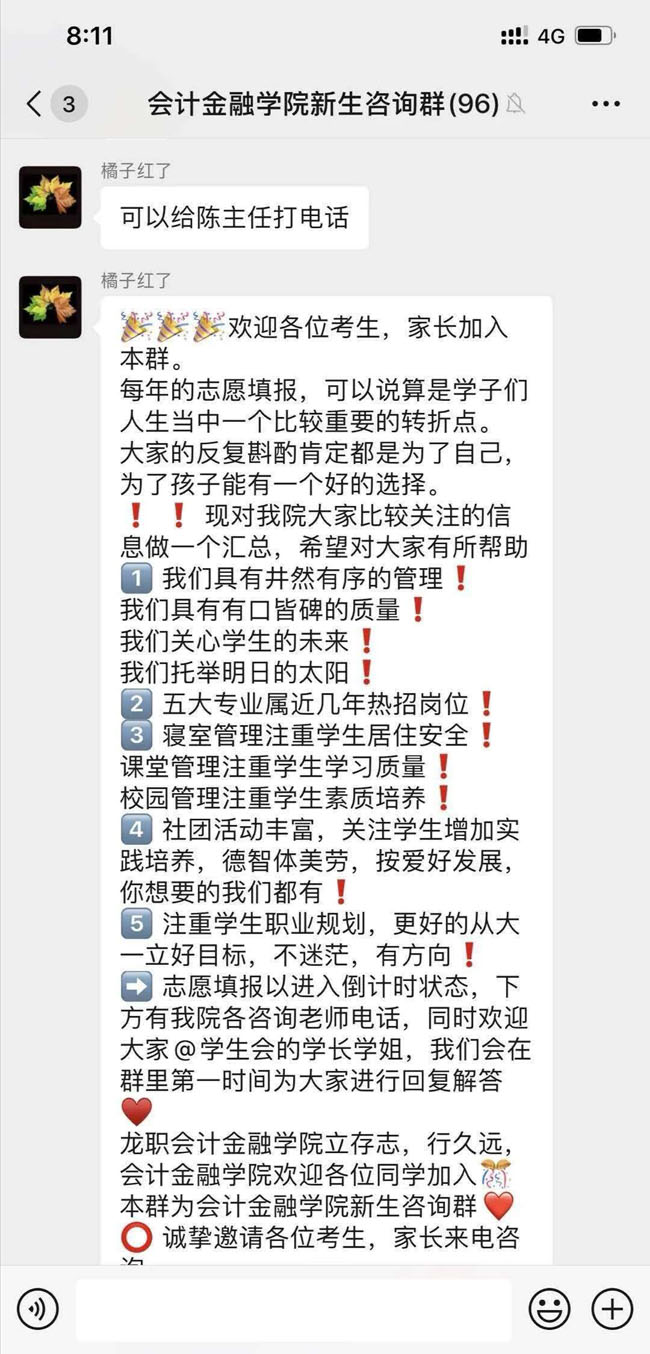 高考成绩公布后,便迎来了志愿填报的关键时期,高考择校志愿填写成为了考生及家长最为关心的问题。为全力做好新高考改革下的招生工作,吸引更多优质生源、宣传我院专业特色、更好地为考生及家长答疑解惑,会计金融学院积极响应学校2020年招生宣传工作部署,由于受疫情影响,学院领导们以及学长学姐组建微信群进行招生宣传工作。