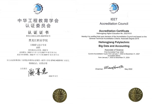 经过近二十年的建设与发展,专业建设成绩显著,为校级课程思政教育教学改革示范专业、黑龙江省高职院校高水平骨干专业、黑龙江省高等职业学校专业诊断与改进试点专业、黑龙江省高职学校学习成果转换规则建设专业、中国商业会计学会“数字化会计教育认定(DAEC)”项目认证专业、悉尼协议应用技术教育(GTAC-AD)认证专业。