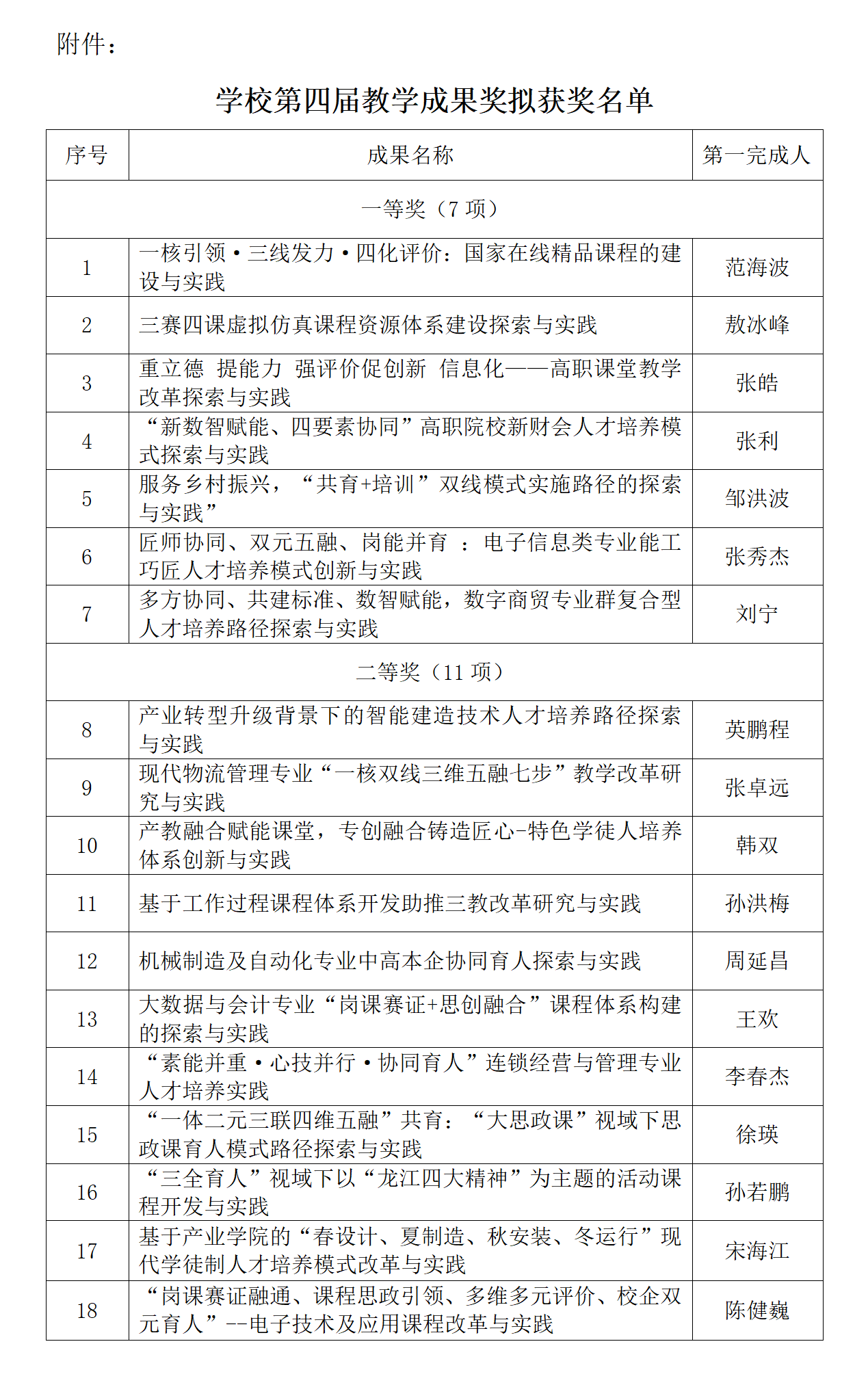 根据《关于开展学校第四届教学成果奖评选工作的通知》安排,学校聘请校外专家组建评审委员会对申报的38项成果进行评选。经过线上初评和线下会评,评选出学校第四届教学成果奖18项(其中一等奖7项,二等奖11项),现将评选结果予以公示,公示期为2023年12月2日-12月6日。