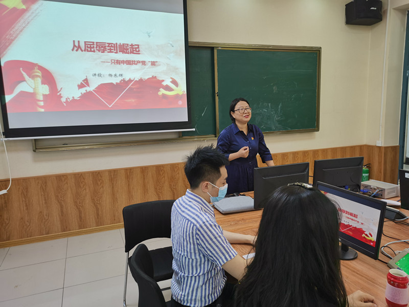 为庆祝中国共产党成立100周年,深入推进党史学习教育,6月16日下午,旅游与人文艺术学院党史学习教育专题党课在学院文翠楼405室举行。学院党总支书记杨东辉以“从屈辱到崛起”——只有中国共产党“能”为题,为教工党员上了一堂精彩生动的党课。