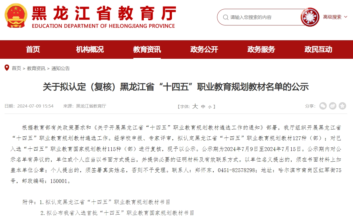 7月9日,黑龙江省教育厅公示了拟认定(复核)的黑龙江省“十四五”职业教育规划教材名单,我院三部教材被认定,分别是薛琳琳主编的《宠物解剖生理》、白彩霞主编的《动物解剖生理》以及孙英杰主编的《牛羊病防治》。此外,八部原职业教育国家规划教材通过复核,标志着我院教材建设工作取得了显著成果。