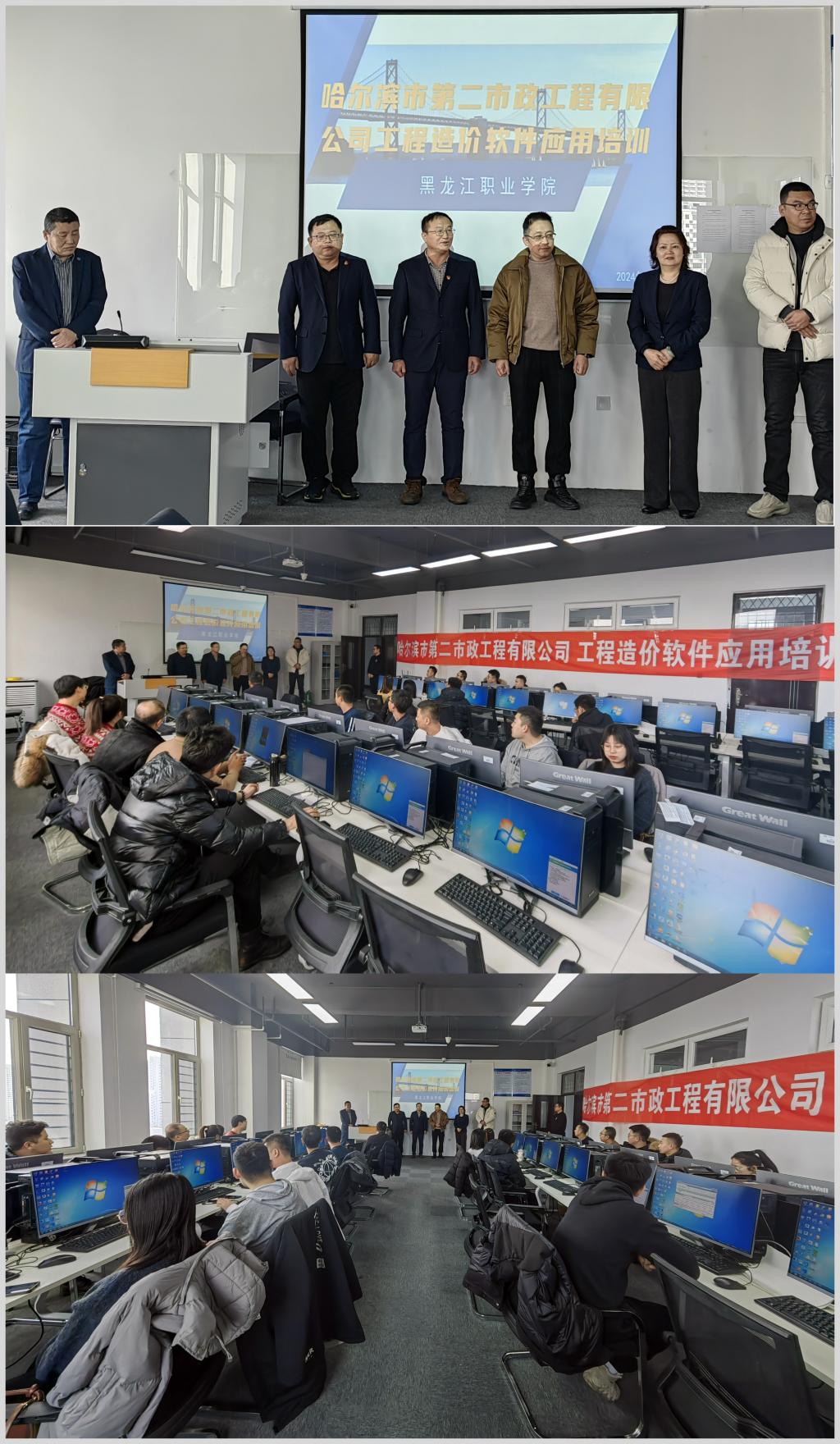 哈尔滨市第二市政工程有限公司为提高企业员工的工程造价业务技能水平,提升员工运用工程造价软件的生产能力,于近日在beat365中国官网建筑工程学院工程造价实训中心举办工程造价软件应用培训。哈尔滨市第二市政工程有限公司总工程师魏赢,建筑工程学院党总支书记范海波,副院长张皓,党总支副书记孙若鹏,教学副院长英鹏程,参加此次培训活动。