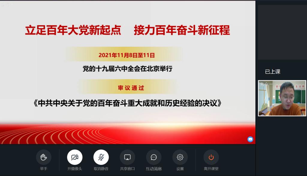为推动党的十九届六中全会精神学习贯彻深入基层,教育引导广大师生深刻领悟“两个确立”的决定性意义,增强“四个意识”、坚定“四个自信”、做好“两个维护”,3月23日,学校宣讲团教师朱今一到我院进行了学习贯彻十九届六中全会精神线上宣讲活动。食品药品学院党总支书记陈晓华、院长赵岩、党总支副书记高财智、教学副院长韩双出席报告会,全体教师、在校学生近800人参加了此次报告会,宣讲报告会由食品药品学院组织员芦清主持。