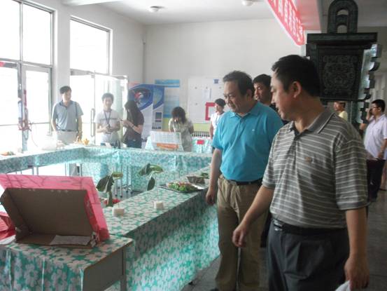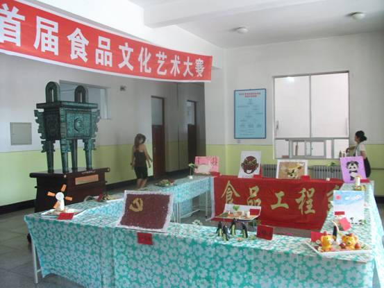 2010年7月4日,为迎接全省高校艺术评估工作,食品工程系隆重举行了首届大学生食品艺术大赛,由同学们亲手雕刻、拼装的食品类手工艺品在实训楼展出,受到领导和专家的一致好评。 本次活动共有13个班级60余名同学代表参加,共展出作品30余件,其中“幸福猪”、“牧院风情”、“抗震救灾”、“企鹅一家”等作品给大家留下深刻印象。 此次活动充分发挥同学们的想象力,同时也提高了大家的动手能力,丰富了同学们的课余文化生活。 同学们的参赛作品在实训楼展出 领导和专家在参观作品