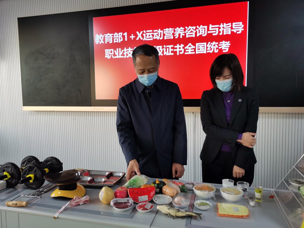 在实操考核现场,学院党总支书记陈晓华、教学副院长韩双亲临现场指导,体验膳食营养配餐实践环节,陈书记在实操现场表示:“1+X运动营养咨询与指导职业技能等级证书的技能考核现场是一个微型厨房,为提高学生将营养健康与日常膳食有效结合提供了非常好的平台。”