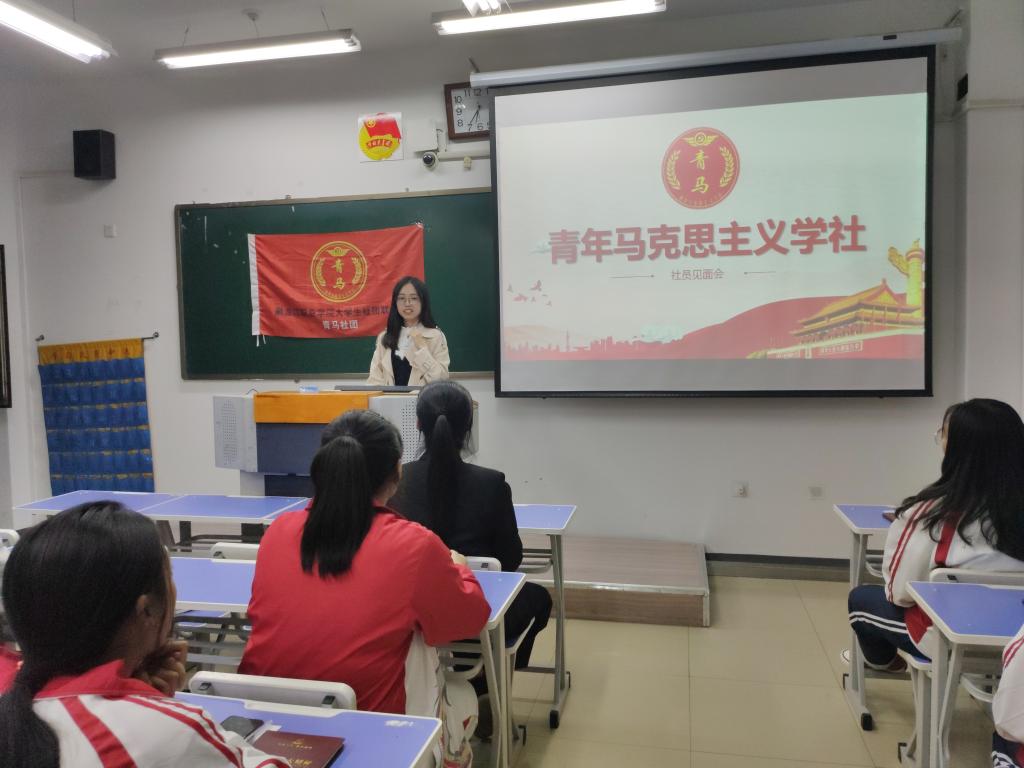 见面会开始,由社长于永泽主持,引入主题。之后由社团指导教师赵婷玉和社长于永泽为社员发放小礼物——印有十九大精神笔记本一个。然后,由社团指导教师朱今一发言。朱老师用风趣的语言给新加入的社员们科普了一下青马社的由来和历史。并将青马承载的历史和青马人所追求的一份热血情怀摆在了每一个将要为这个组织发光发热的社员面前,也把青马社未来建设和发展任务给大家做了简略的说明。随后由赵老师讲述自己与青马社的渊源,让同学们对于青马有了不同以往的认识,原来马克思很年轻。更加深了新人对于青马的归属感。