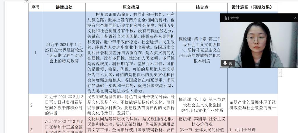 根据提前布置的备课方案,团队教师按照“经济、政治、文化、生态、社会、国防军事”等内容方向分别查找和梳理习近平总书记最新讲话、指示批示以及文章精神,结合该部分教学内容寻找融入点并进行相应的教学设计,形成初步的备课思路,为召开线上备课会集体研讨做好准备。