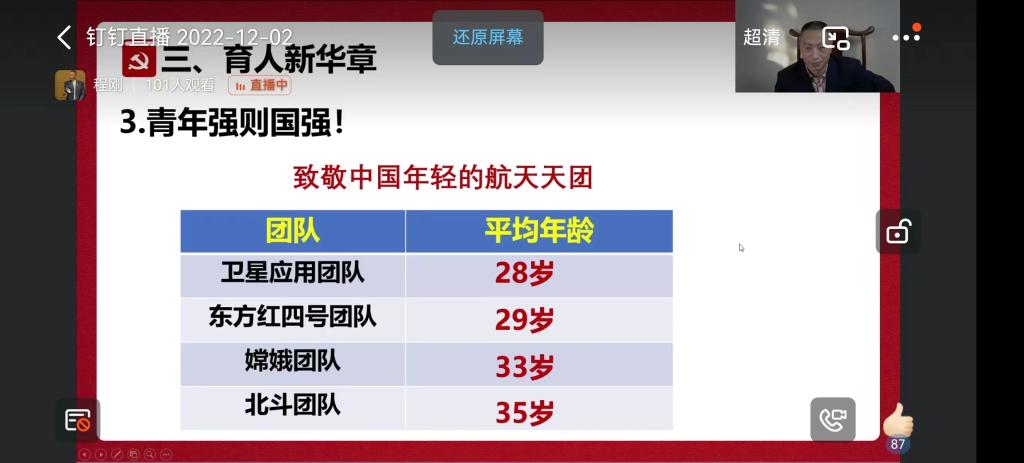 2022年12月2日下午1点30分,马克思主义学院党总支程刚以“党的二十大精神指引,培养革命接班人”为题进行宣讲,马克思主义学院全体无课教师参会,宣讲钉钉线上进行。