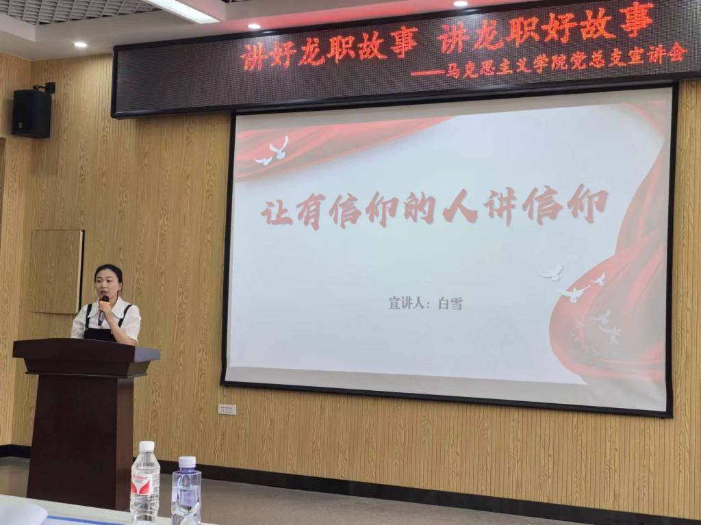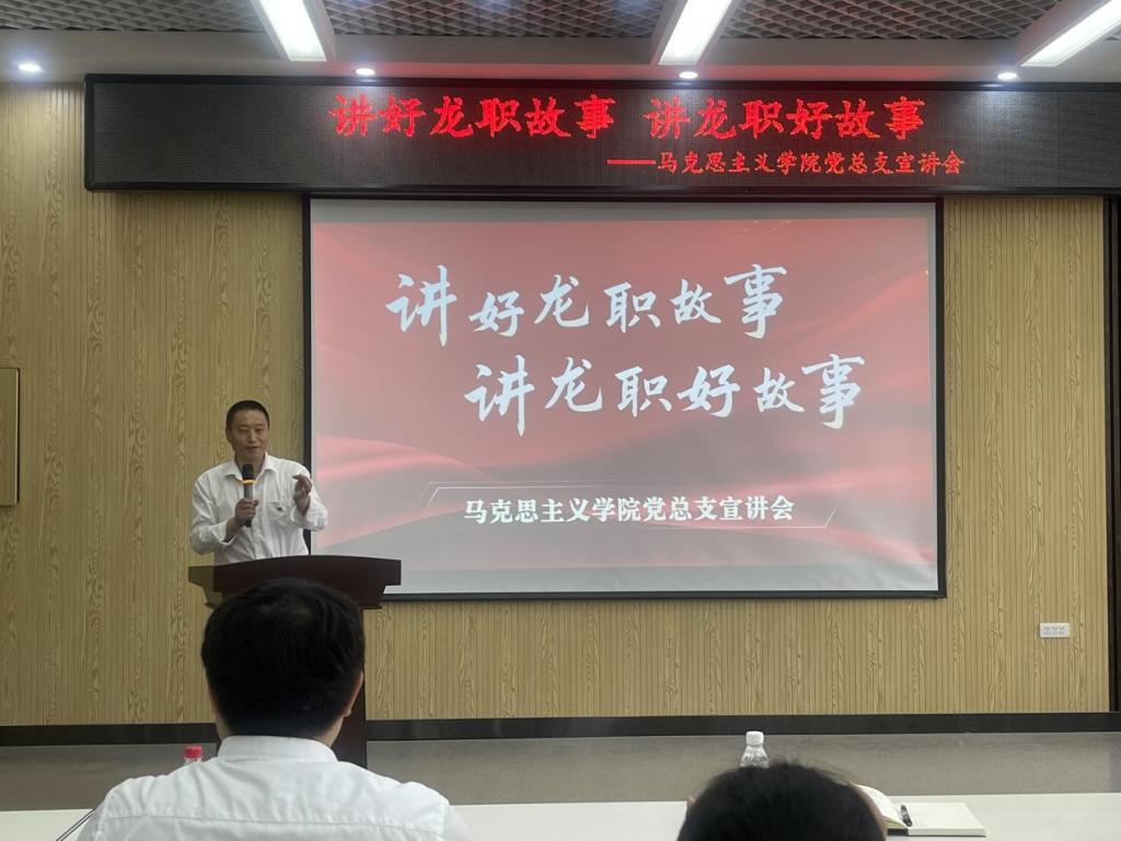 为落实立德树人根本任务,深入推进“铺路石”文化建设,弘扬榜样力量,7月10日,马克思主义学院开展“讲好龙职故事,讲龙职好故事”宣讲活动。学院党总支书记程刚、综合办主任徐瑛和全体教师参加活动,活动由习近平新时代中国特色社会主义思想概论教研室主任张旭主持。