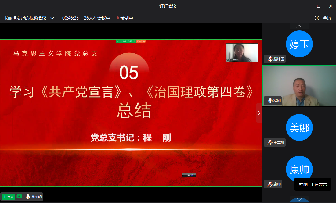 为迎接党的二十大胜利召开,马克思主义学院教师第三、第四党支部组织全体党员读原著、学原文、悟原理,努力做到学懂弄通做实,入脑入心入行。2022年9月30日下午1点30分马克思主义学院全体党员齐聚云端召开了理论学习会议,张丽艳同志代表第三、第四党支部主持学习《共产党宣言》的时代价值和《习近平谈治国理政》第四卷谈以人民为中心。本次集体学习共分为三个部分: