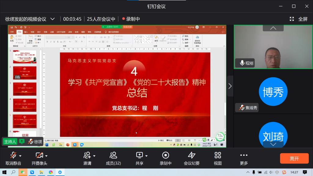 党的二十大胜利召开以来,在马克思主义学院党员中形成理论学习的新热潮。2022年11月4日下午1点30分,马克思主义学院党总支开展线上《共产党宣言》、学习贯彻党的二十大精神的学习活动,活动由教师第三、第四党支部组织,教师第三党支部徐瑛同志主持,马克思主义学院全体党员参加会议。学习内容主要包括《共产党宣言》和党的二十大精神的学习。
