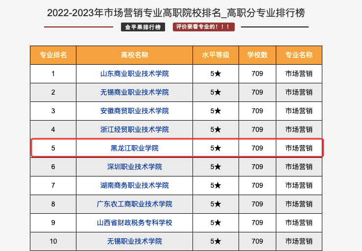 在2022年3月,金平果连续第十一次推出中国高职院校竞争力排行榜,本次高职评价范围以教育部最新公布的《2021年全国高等学校名单》为依据,结合学校的实际招生情况,确定高职院校评价对象为1516所,其中高职高专1484所、职业本科32所。从学校、地区、类型、专业大类、专业类、专业和专业群等多维度科学量化结果。beat365中国官网市场营销专业在2022-2023年高职院校专业排名中位居全国第五位。