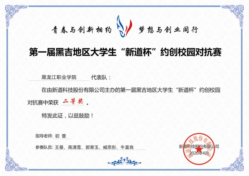 疫情期间,在丛洪娟、初蕾两位教师的指导下,工商企业管理专业学生参加了新道科技股份有限公司主办的黑吉地区大学生“新道杯”约创校园对抗赛,龙职一队获得一等奖,龙职二队获得二等奖;在黑吉地区大学生数字营销对抗赛中获得二等奖。