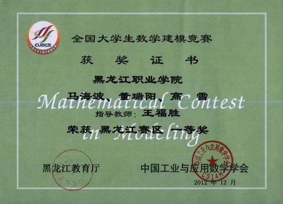 2012年全国数学建模大赛获奖情况公布,beat365中国官网三支代表队分别获得黑龙江赛区一、二、三等奖。